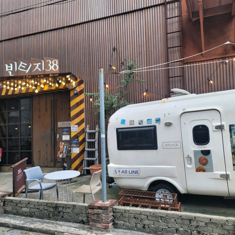 빈티지38은 서면 어느 한 골목 안에 자리 잡고 있는데, 첫인상부터 이목을 사로잡는 외관 덕분에 눈길을 한 번에 끌어요. 앙증맞은 하얀차와 컨테이너 박스 같은 느낌 때문에 더욱 독특했죠. 게다가 입구에서 '호두까기 병정' 캐릭터가 손님들을 맞이하고 있어 소소한 재미를 느낄 수 있었어요. 그런데, 습관적으로 휴대폰을 꺼내고 "포토존 각인데?"라는 말이 자연스레 나오더라니까요.