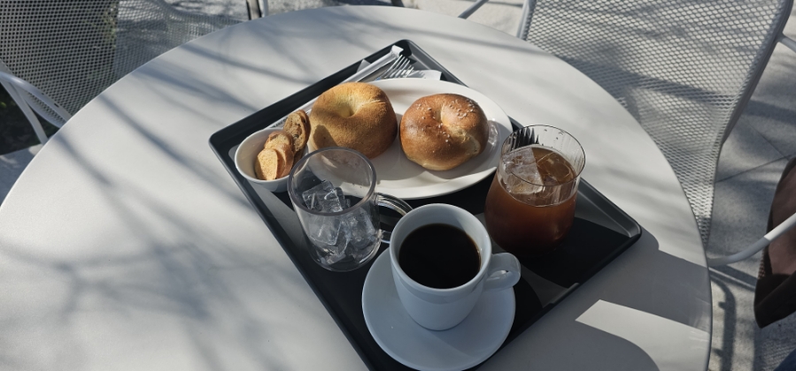카페에 도착하자마자 느껴진 건, 바로 정원 느낌이야. 입구에서부터 구불구불한 작은 길과 푸릇푸릇한 나무들, 멀리 보이는 하늘과 바다가 정말 그림 같았어. 뭔가 교외의 한적함과 여유가 철철 넘치는 곳이랄까? 그리고 안으로 들어오면 높은 건물이 아니라 낮고 조화롭게 건축된 공간들이 담백하게 반겨줘. 정원 사이사이에 있는 테이블은 야외 감성을 만끽하기 딱 최고의 자리야!