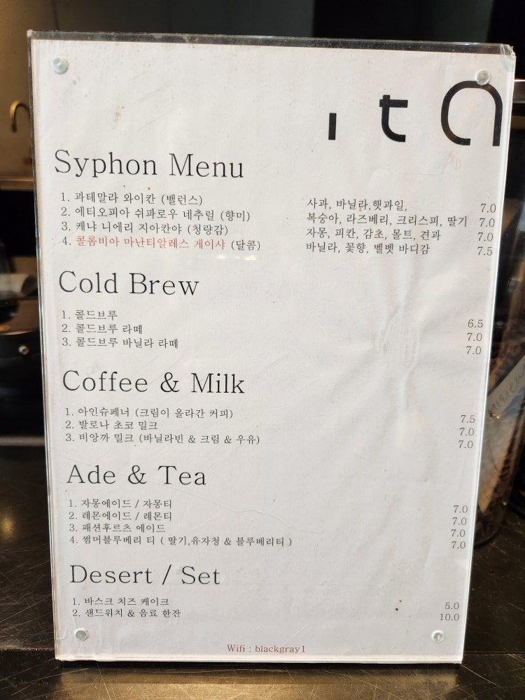 • 사이폰커피는 주문 후 추출 시간이 5~7분 정도 걸리니 여유 있게 즐기고 와.